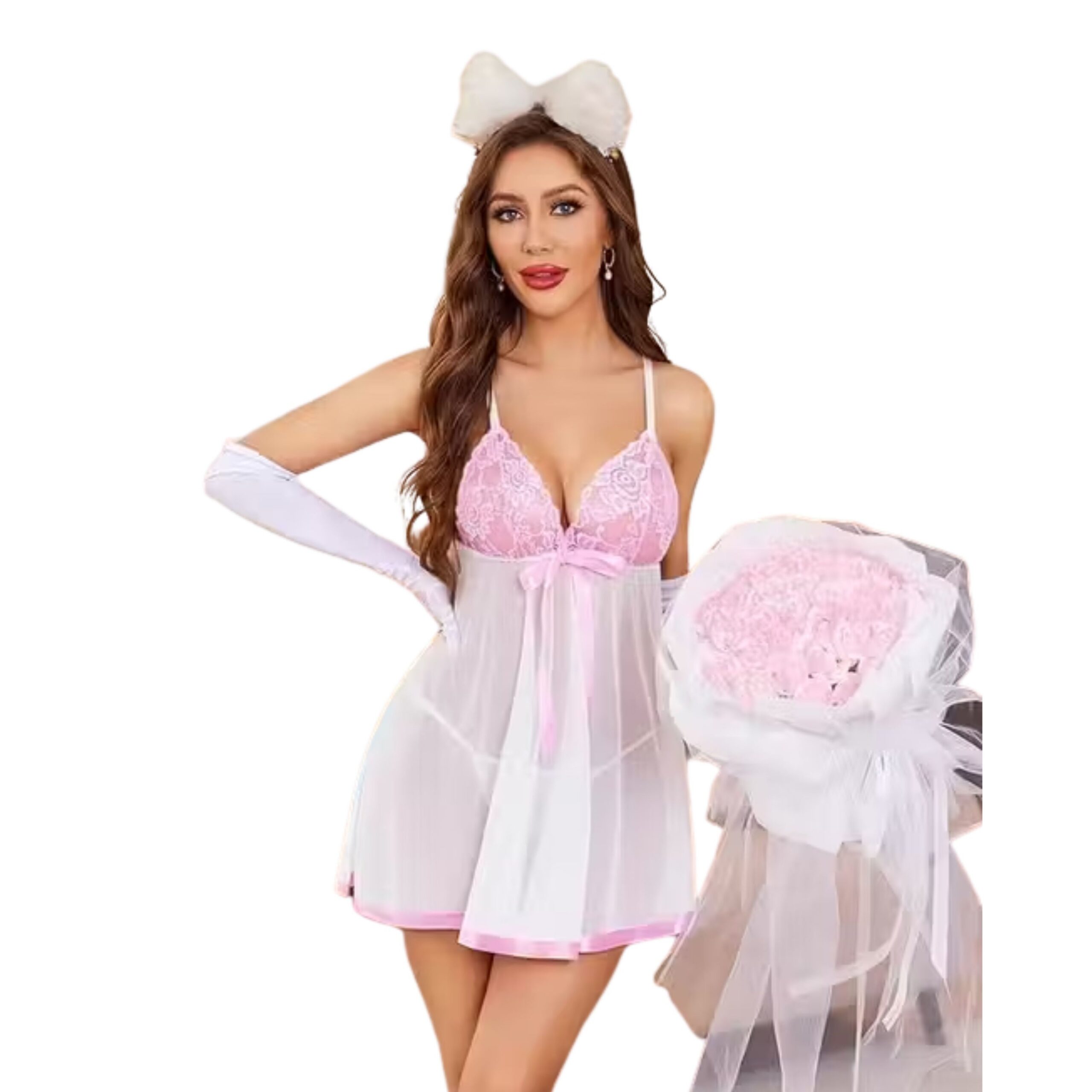 A whimsical, two-tone babydoll nightdress featuring a delicate pink lace bodice and a sheer white mesh skirt. This set combines a flirty, high-waisted silhouette with romantic satin ribbon accents, making it the perfect choice for an elegant yet playful evening.
