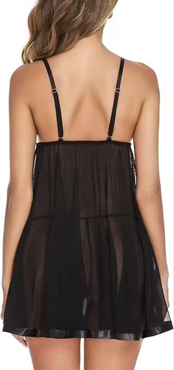 • Includes: Lace-trimmed mesh babydoll and a matching minimalist G-string.